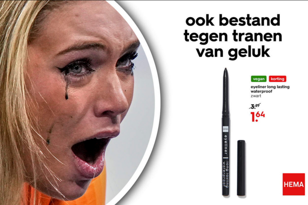 Leerdam reed naar het goud in 1.12,31. Na de finish volgde de ontlading. In interviews vertelde ze dat haar make-up “overal zat”, maar dat ze dat als een goed teken zag. HEMA koppelde dat moment vrijwel direct aan een product uit het eigen assortiment en plaatste op sociale media een beeld van waterbestendige eyeliner met de korte boodschap dat die “ook bestand is tegen tranen van geluk”. Simpel, herkenbaar en precies op het juiste moment.