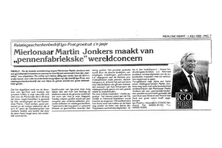 IGO Promo bestaat 80 jaar. Het bedrijf, opgericht in 1945 door Martien Jonkers, behoort tot de pioniers op het gebied van relatiegeschenken en promotionele artikelen....