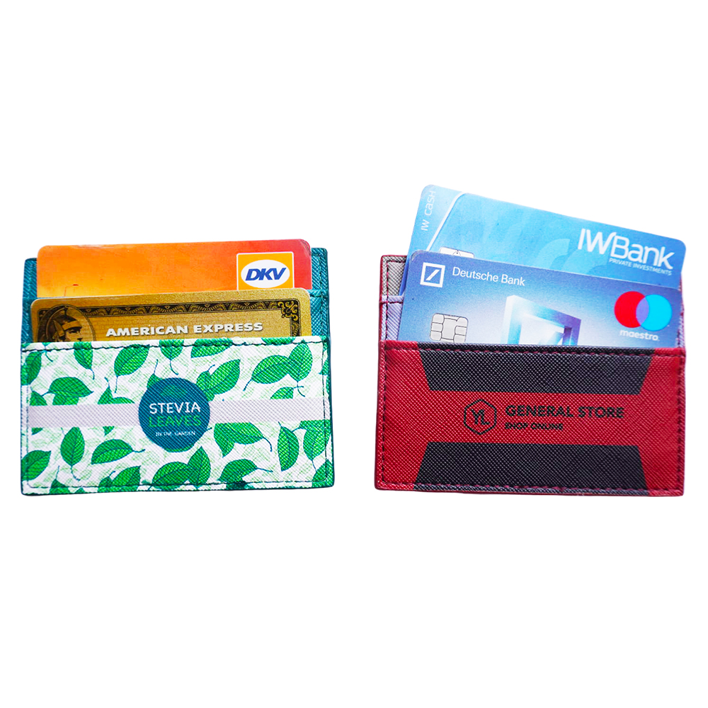 Premium Kaarthouder, volledig all over bedrukt in eigen huisstijl. Kenmerken: Materiaal: 100% PU leer