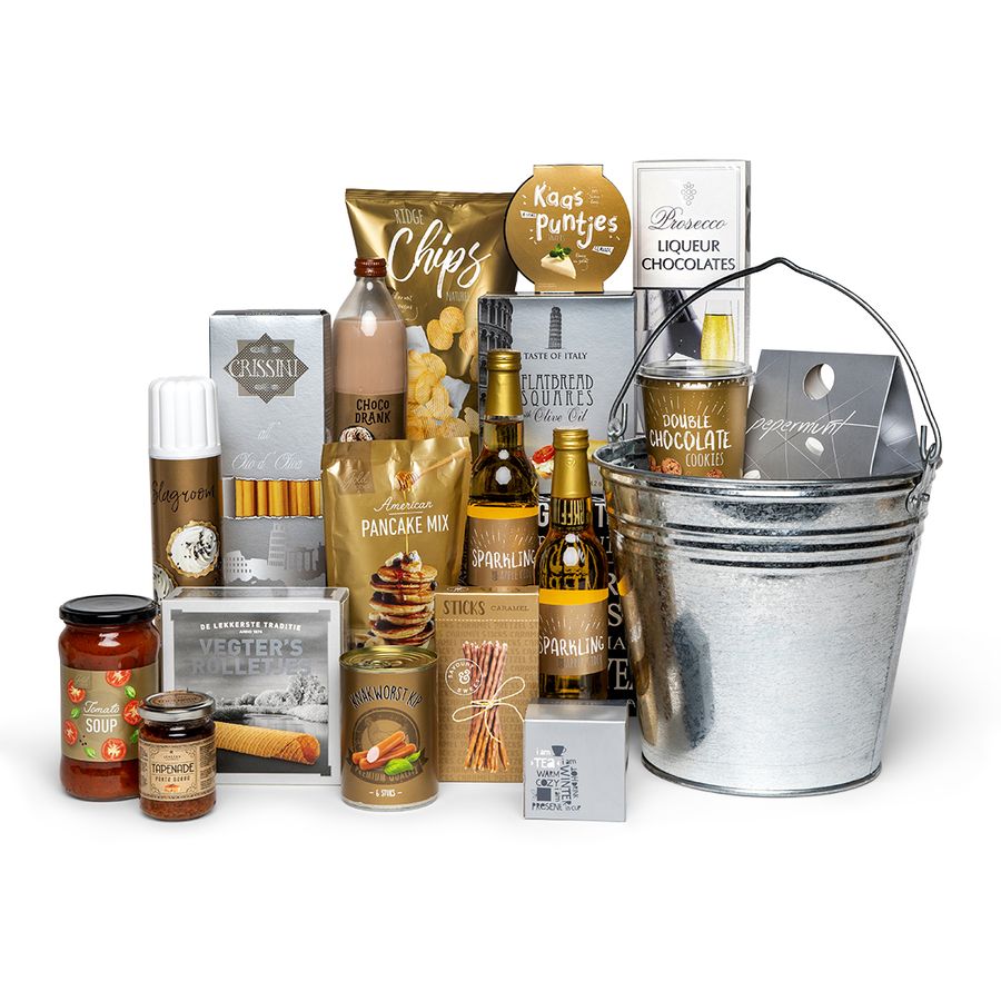 Wij hebben deze leuke zinken emmer gevuld met uitsluitend smaakvolle producten in feestelijk goud en zilver, zodat u lekker kunt genieten.