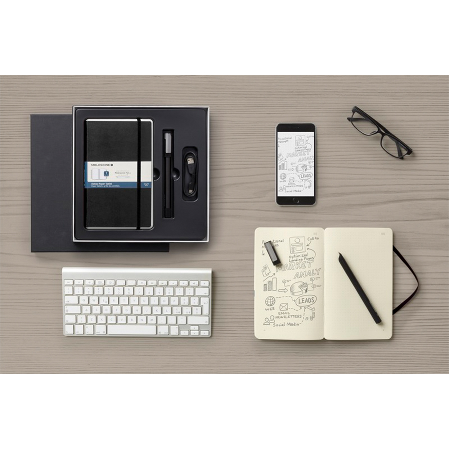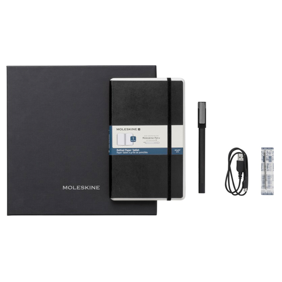 Smart schrijfset ellipse. De Smart schrijfset bevat de Pen + Ellipse smart pen en een groot gelinieerd notitieblok met speciaal Ncoded papier. Samen met de Moleskine Notes App schrijf je op de pagina's van het notitieblok met de Pen + Ellipse voor direct gedigitaliseerde notities die kunnen worden gewijzigd, getrancribeerd, georganiseerd en opgeslagen op het apparaat van jouw keuze. Inbegrepen in de verpakking: Notitieblok met speciaal papier dat is gemaakt om te werken met Pen+ in ruled layout, Pen+ Ellipse smartpen, USB-kabel voor het opladen van de smartpen, 1 inktvulling, Volant XS starter dagboek en gebruikshandleiding. De Smart schrijfset Ellipse werkt met alle andere Moleskine notitieblokken en Smart dagboeken/agenda's. PP - polypropyleen.