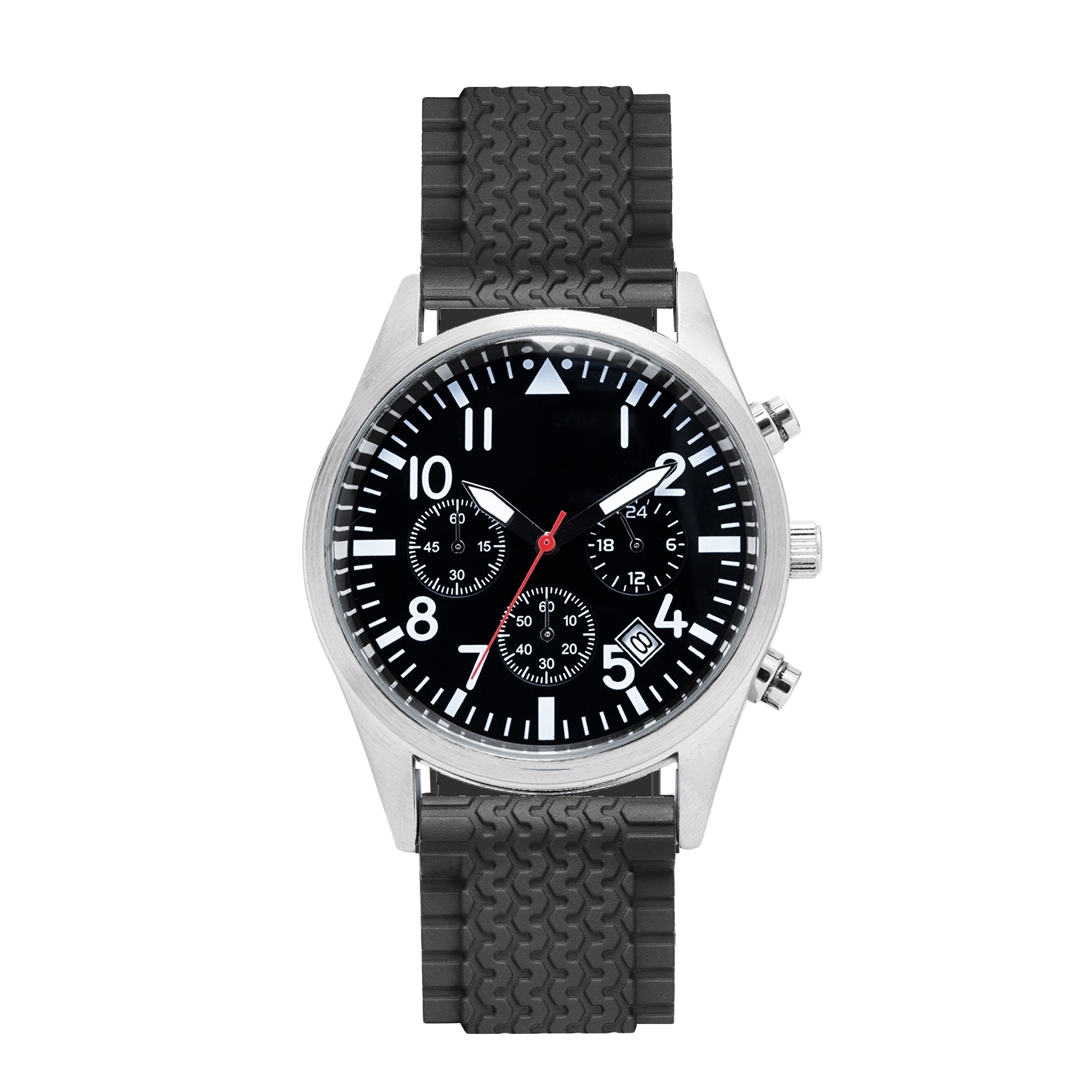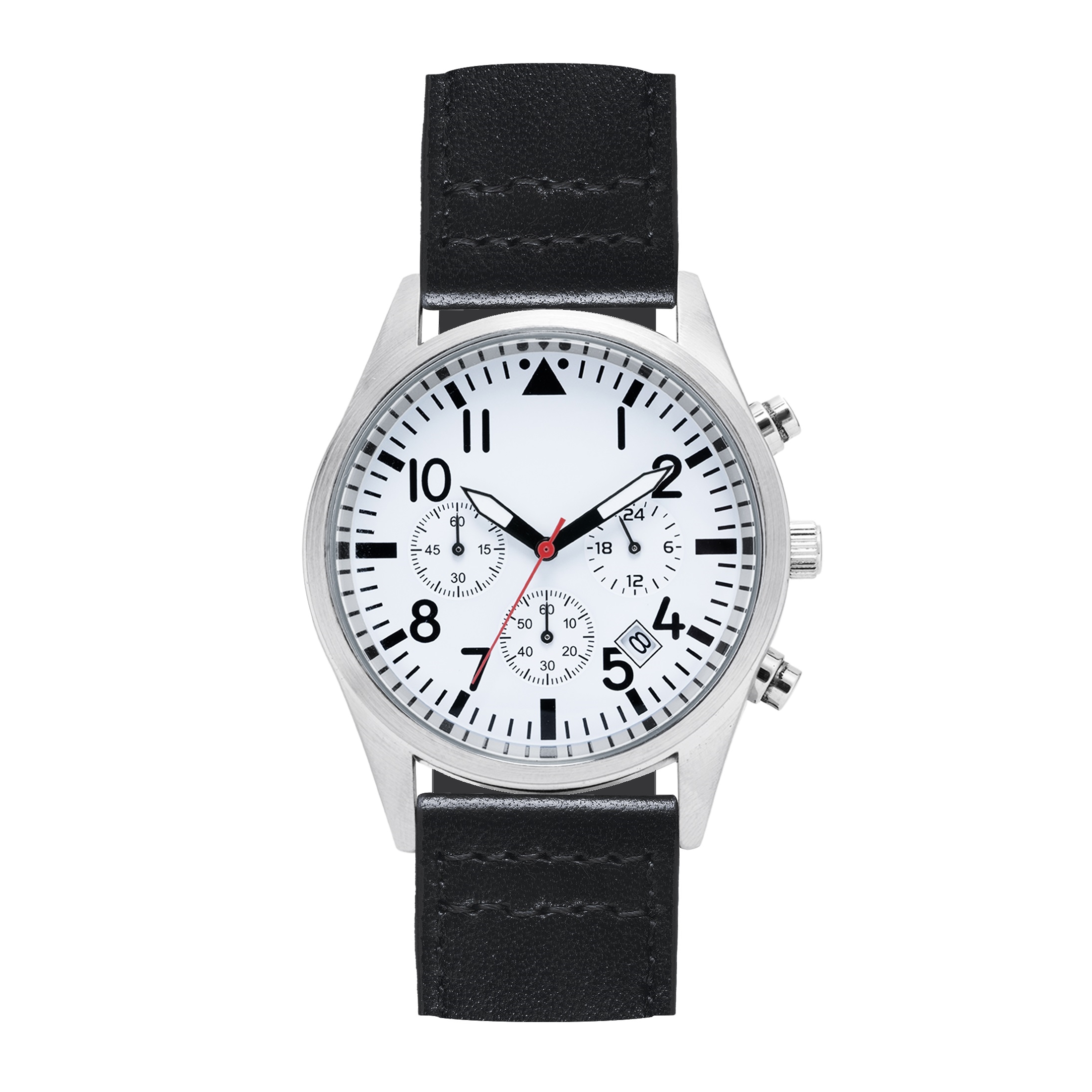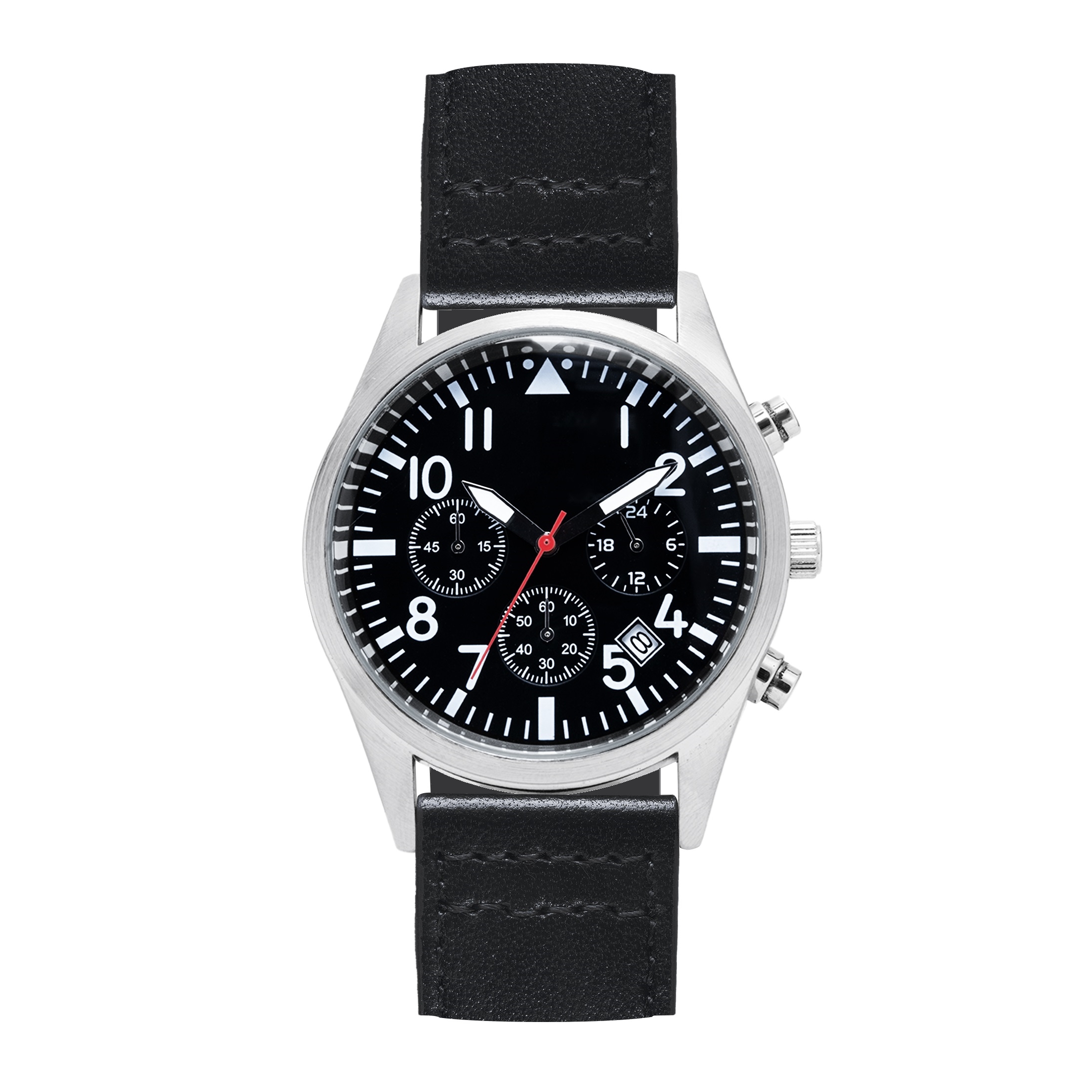 Een van onze meest populaire horloges, de Pilot Lugano, dit horloge met een 42mm klok is in zowel een analoge als een chronograaf variant en met PU lederen of rubberen band beschikbaar. Dit model is uitgerust met een Seiko VD 53 uurwerk en heeft een waterbestendigheid van 3 ATM. Minimale afname: 25 stuks. Voor een ontwerp op maat, neem contact op en stuur ons het logo. Dit horloge wordt geleverd in een zwart kartonnen doosje.